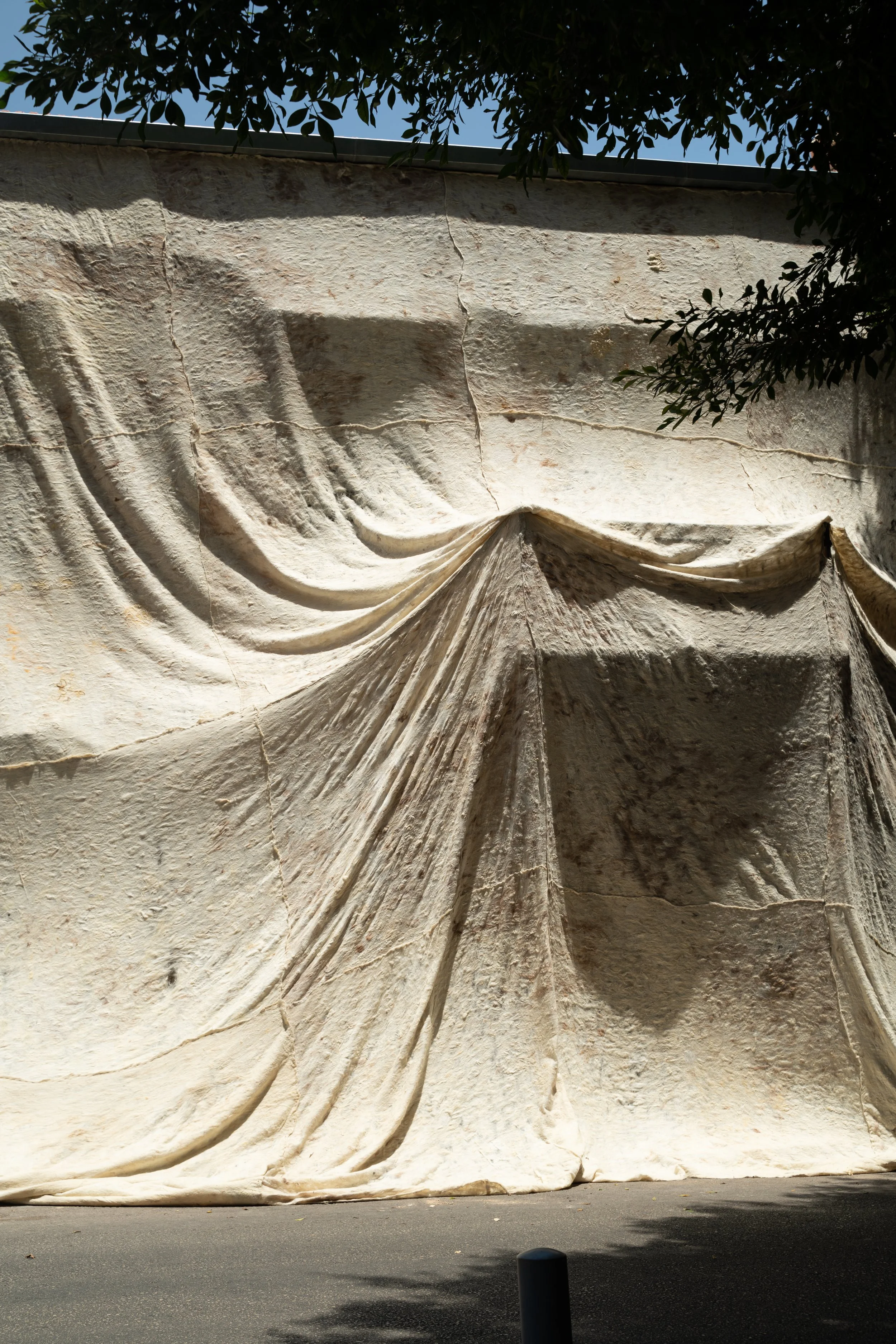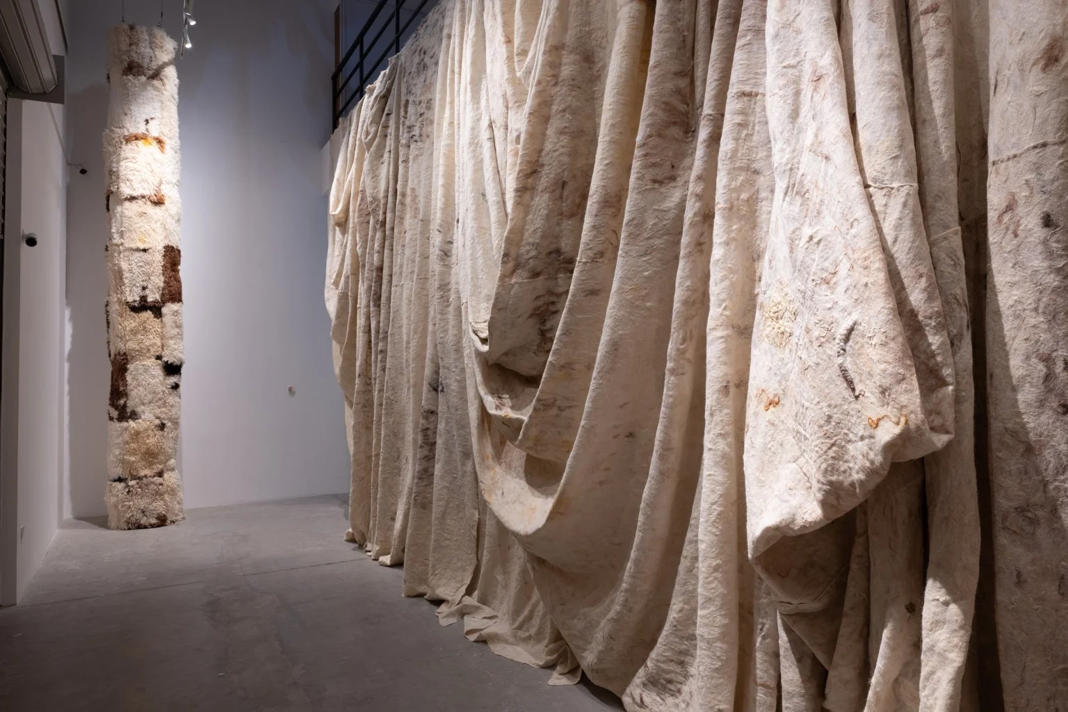 Deep voluminous pleats that pool slightly at the floor and hang from ceiling level give artist Adrian Pepe’s curtain installation a kind of regal grandeur reminiscent of a royal bedchamber. The scale of the artwork, which stretches across the entrance of the gallery and presents a threshold between Pepe’s exhibition and the outside world, adds to its drama. Yet, upon closer inspection, this curtain is a far cry from opulence; nor does it have a utilitarian purpose. It is a hand-felted material; a gritty, rough mesh, surprisingly lightweight and fragile, fashioned from sheep wool. Pepe, a fibre artist originally from Honduras in Central America, lives and works in Lebanon. He made the work for a public installation in Beirut in 2024, where it wrapped a building damaged by the city’s devastating port explosion four years prior. For this exhibition, the work has been resized and renamed. The largest portion, Shroud (2024), gives this exhibition at NIKA Project Space its title: A Shroud is a Cloth.